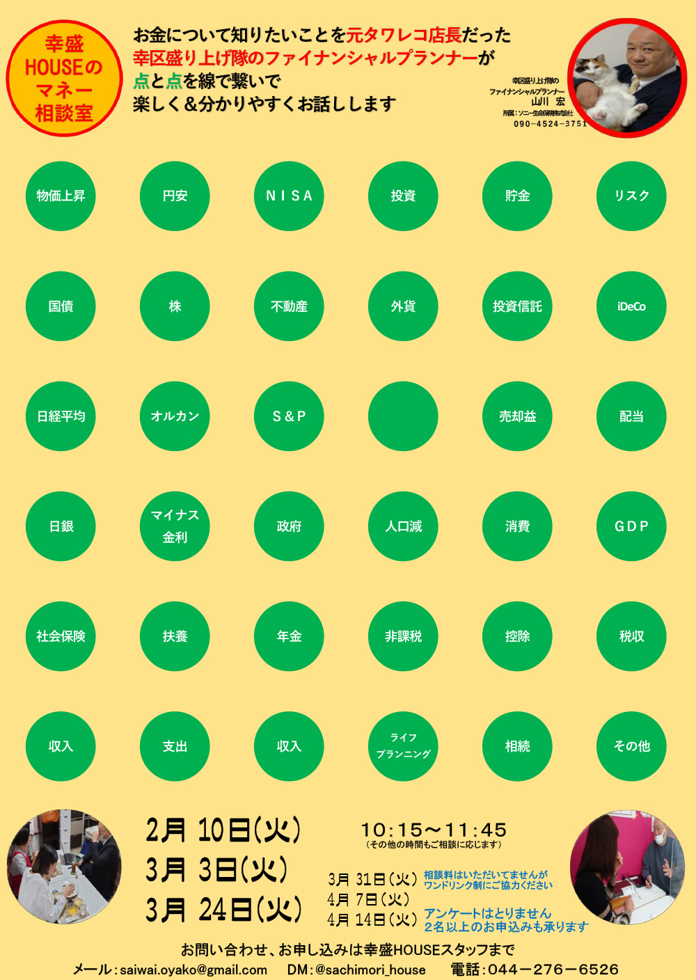 | お問い合わせ・申し込み方法 | お問い合わせ・お申込みは、幸盛HOUSE スタッフまで! 【メール】saiwai.oyako@gmail.com 【Instagram】@sachimori_house 【TEL】044-276-6526 |