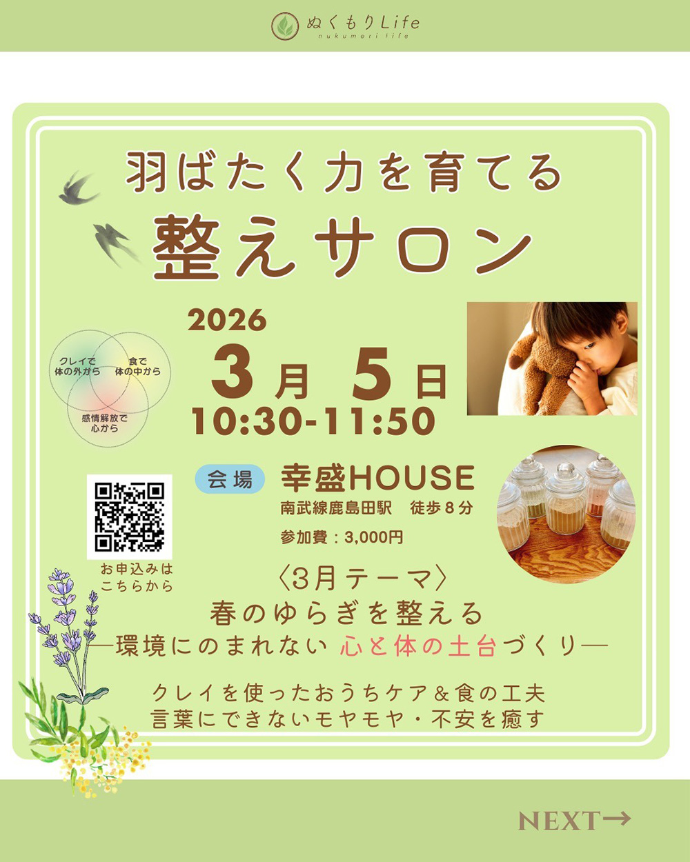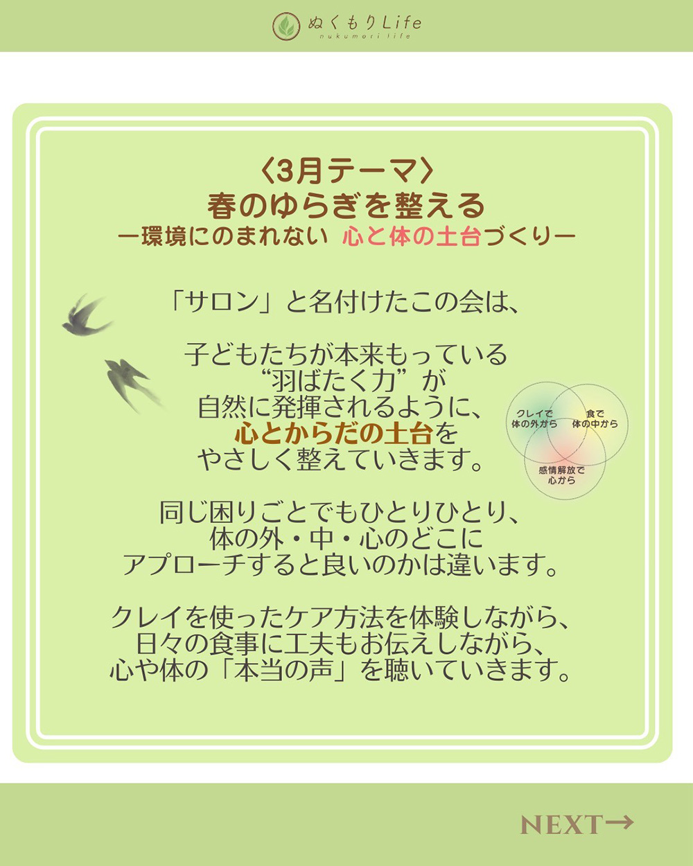 「サロン」と名付けたこの会では、子どもたちが本来もっている“羽ばたく力”が自然に発揮されるように、心とからだの土台をやさしく整えていきます。