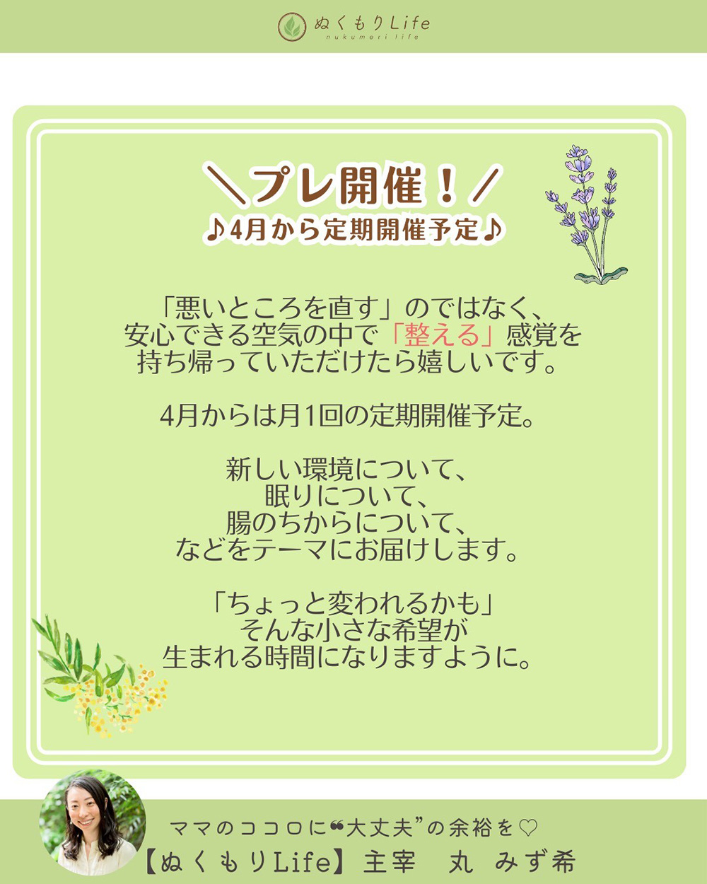| 講師 | 丸 みず希 @zukki_nukumori @zukki__ouchigakushu 小6・小3の母。 子どもたちが保育園の頃は夫が単身赴任の中、フルタイムで仕事復帰。 小中学校栄養士として計18年勤務。 2023年に退職。 「クレイ」には我が子の喘息ケアから出会いました。 統合食養学ヘルスコーチ、腸活インストラクター、ここまる育才アカデミー認定講師。 小中学生の生活塾での支援アシスタント。 それぞれの活動は全て、子どもたちが本来の才能を生かして、力強く羽ばたける未来のために【ぬくもりLife】として、親子を本当に健やかにするサポートをしています。 ・未就園児親子向けの食育講座 ・小学生向けオンライン食育講座 ・高校生向け栄養士の職業講話 ・クレイを使った手作りスキンケア &コスメのワークショップ ・心の感情解放セッション ・体の外・中・心から整える 本当の健康講座 を開催しています♪ |