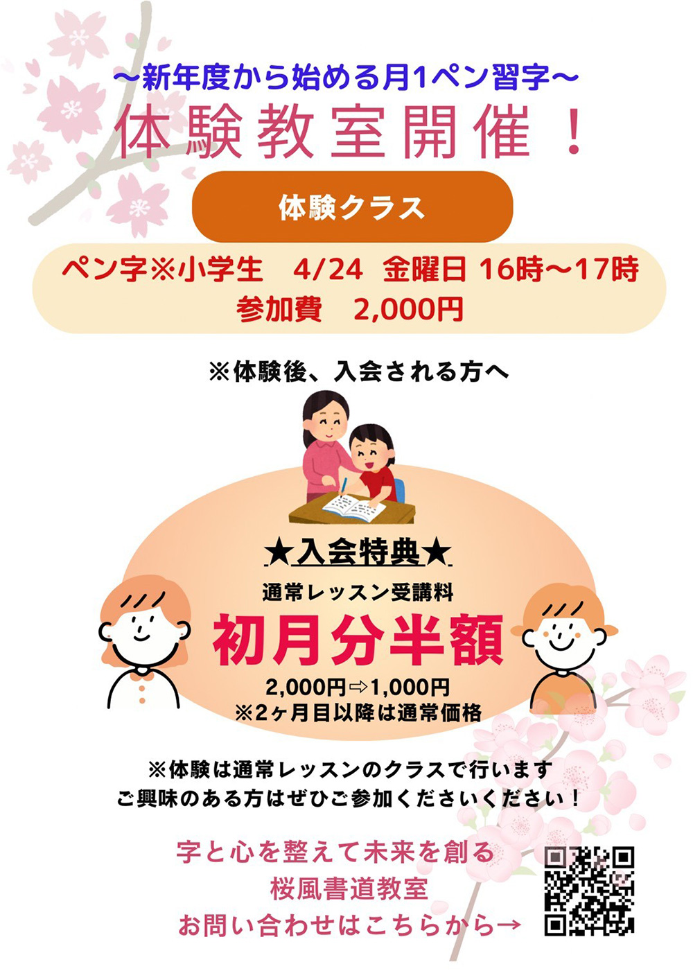 | お問い合わせ・申し込み方法 | instagram教室アカウント @oneselfsyodouより DMで”ペン字体験参加希望“と明記して送信してください。 |